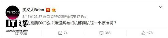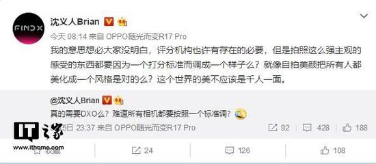 OPPO副总裁沈义人在微博对DxOMark的评分进行质疑,他认为评分机构固然有存在必要,但不应按照他们制定的标准调,今天小米产业投资部合伙人孙昌旭对DxOMark进行了声援,她表示其测试标准严格,体现了综合能力。