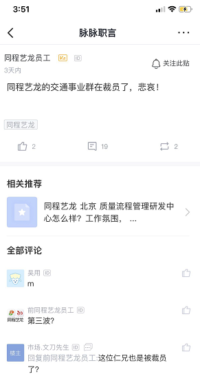 与此同时,三言财经在脉脉发现,也有认证的同程艺龙员工发言称交通事业部在裁员。