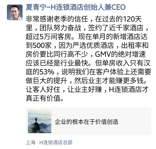 6月19日晚间消息,H连锁酒店创始人兼CEO夏青宁今日在朋友圈分享了一组最新数据:H连锁酒店在过去四个月已签约近千家酒店,超过5万间客房,目前单月新增酒店达到500家。