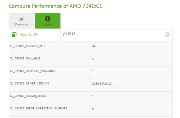 如今在ComputeBase测试数据库中,又出现了一款设备ID 7340:C1、核心编号gfx1012的新卡,明显隶属于Navi家族,检测有24个计算单元,也就是1536个流处理器。