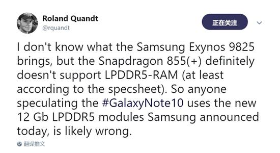 7月19日,Roland Quandt在推特表示,根据高通公布的规格表,骁龙855和骁龙855 Plus均不支持LPDDR5内存,因此三星Galaxy Note 10首发LPDDR5内存极有可能是错误的。